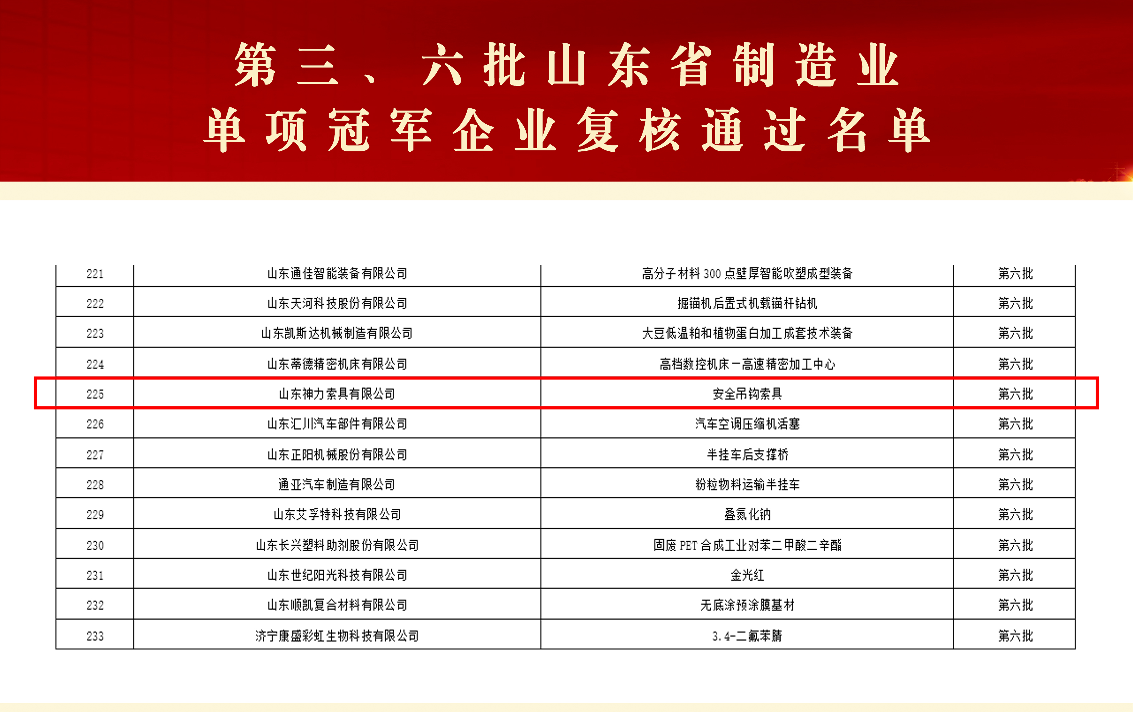 近日,山東省工業(yè)和信息化廳正式公布第九批山東省制造業(yè)單項(xiàng)冠軍企業(yè)及通過復(fù)核的第三批、第六批企業(yè)名單。神力索具憑借在安全吊鉤索具領(lǐng)域的產(chǎn)品表現(xiàn)與技術(shù)積累,成功通過第六批制造業(yè)單項(xiàng)冠軍企業(yè)復(fù)核。